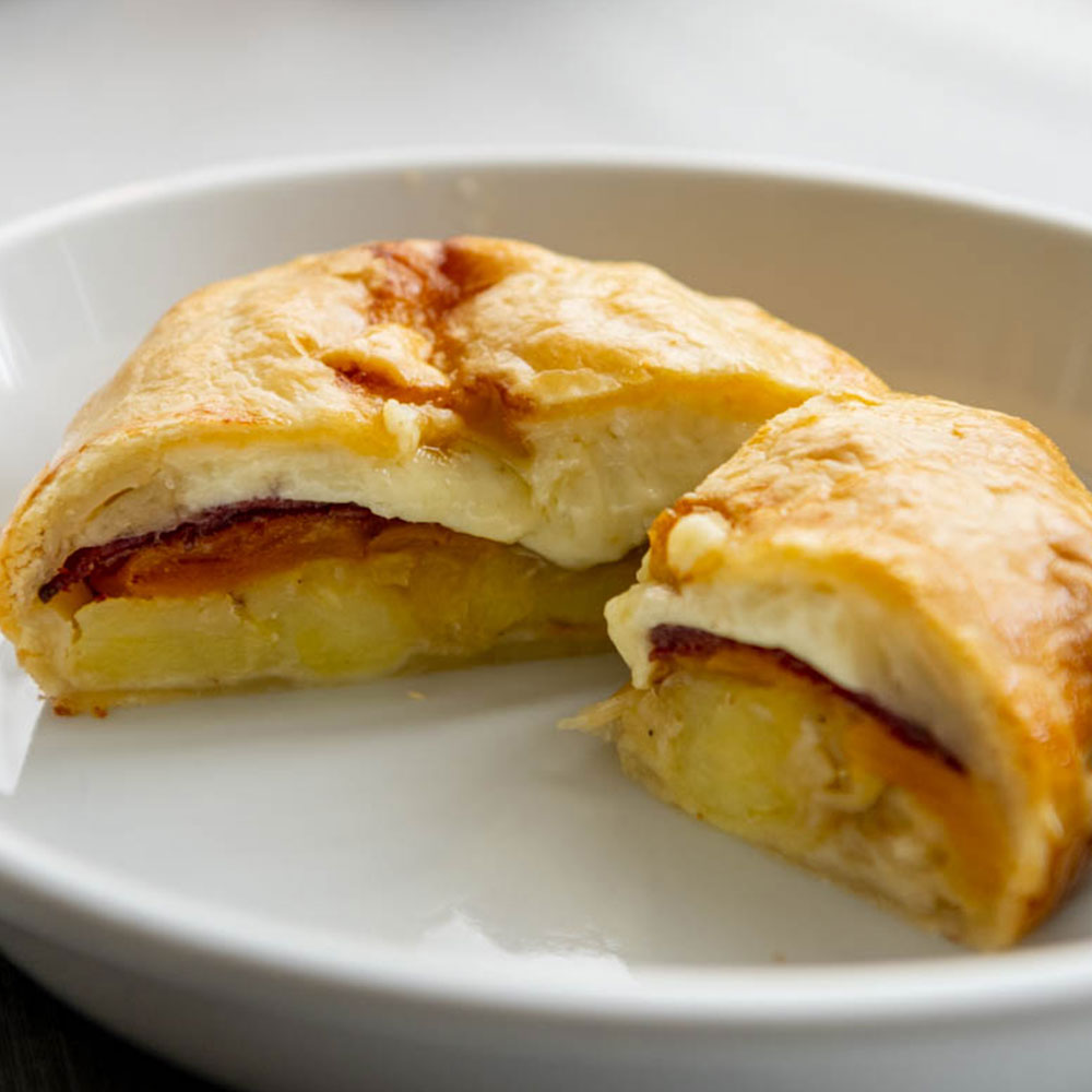 Walliserkuchen aus Kartoffeln, Käse, Aprikosen, Zwiebeln, Trockenfleisch.