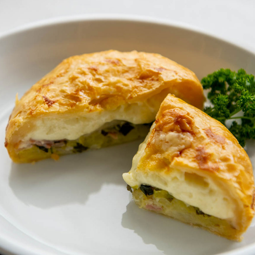 Walliserkuchen aus Kartoffeln, Käse, Birnen, Lauch, Speck.